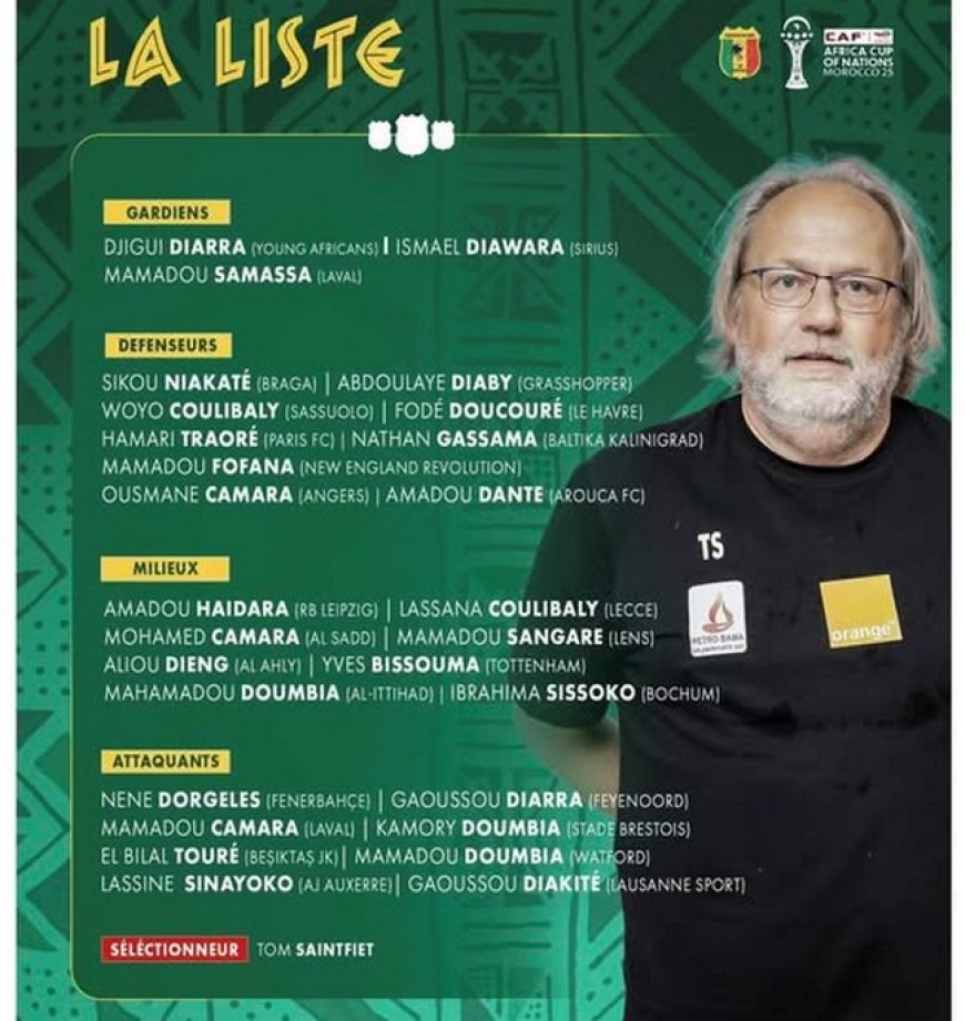 Le sélectionneur national des Aigles du Mali, Tom Sainfiet, a dévoilé, jeudi au journal télévisé de 20 heures de l’ORTM, une liste de 28 joueurs retenus pour la phase finale de la Coupe d’Afrique des Nations (CAN) de football, prévue du 21 décembre au 18 janvier au Maroc. Sans grande surprise, tous les cadres de l’équipe nationale y figurent.